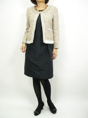 ハリのあるワンピにはツイードのジャケットが良く合います。上品でいながら流行りも押さえたスタイルに!エレガンス度70%、スタイリッシュ度30%。