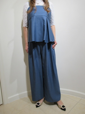 (ビスチェのセットアップ)ビスチェとワイドパンツのセットアップ。きれいめのブルーが春から夏にかけて活躍できる1枚。インナーはレトロなレースのカットソーで合わせたトレンドコーデ。