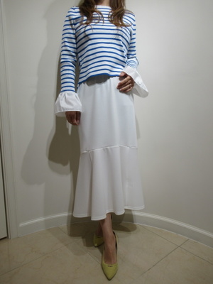 (ボーダーのトップスに白のスカートで)袖が異素材のベルスリーブがキュートなデザインのトップスに白のスカートでリンクさせたコーディネート。春らしい爽やかなコーデで一気に春気分。