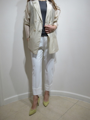 (ざっくりジャケットを羽織る)透け感のある軽くて薄手なビックシルエットジャケットを無造作に羽織ってみました。白のパンツはすっきりしたテーパードでおしゃれに着こなして。