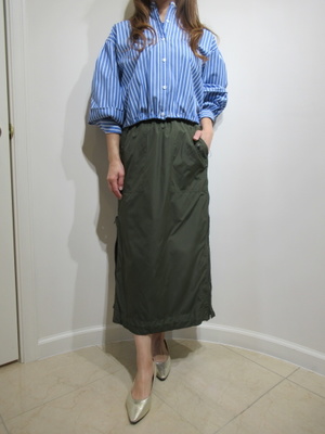 (カジュアルなスカートはデイリーにぴったり)脇に遊び心のあるデザインスカートはカジュアルテイストにぴったりな1枚。ストライプの短丈ブラウスに合わせて春のカジュアルコーデの完成です。