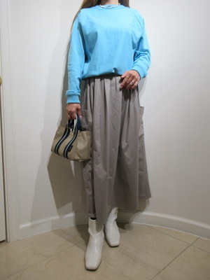 (ブルー×ベージュのコントラスト)きれいなブルーのニットはギャザースカートでシンプルにコーデで春のお出かけに良いですね。アクセントにメッシュのトートバッグを持ちました。