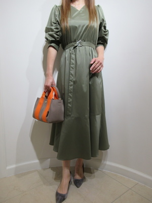 (袖のギャザーが特徴のワンピース)ウェストマークのワンピースは袖のギャザーでボリュームを出したおしゃれな一枚。胸元もV開きでスッキリしたデザインです。