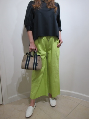 (ネイビーと黄色のコントラストが春)ネイビーに相性が良い黄色のパンツをチョイスして春を満喫。ちょっと甘口コーデのフェミニンスタイル。