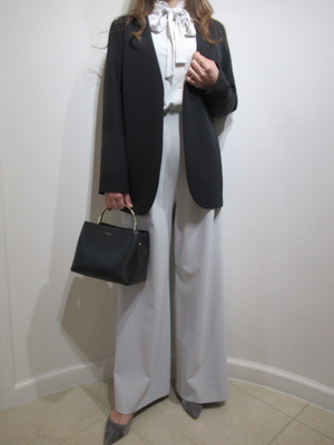 (ソフトジャケットをエレガントに)ワイドパンツとジャケットの組み合わせ。ジャケットの質感がソフトな素材を選ぶととパンツスタイルが柔らかい印象になる。パンツ派のセレモニーコーデ。