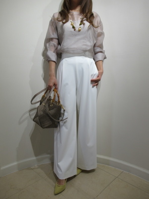(シアーブラウスは今年顔)透け感のあるシアーブラウスは白のワイドパンツと相性がいい。艶のある生地は透け感があってもとてもエレガントな1枚です。