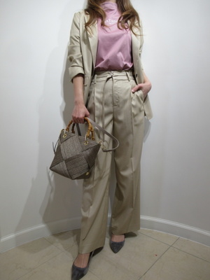 (パンツスーツを着る)新しい季節にふさわしいパンツスーツのコーデ。ベージュ系なので重たくならずそれぞれ他のものとの合わせもOKですね。インナーのピンクのカットソーがベージュによく合いますね。