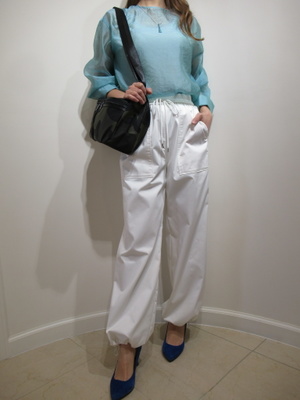 (パラシュートパンツをきれいめに)流行の裾絞りのパラシュートパンツ。エレガントな白をチョイスしてシアーブラウスでコーデ。デイリーもちょっとおしゃれを楽しみたい春ですね。