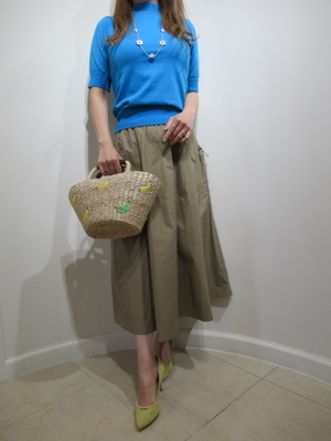(ブルー×カーキのフェミニンコーデ)きれいな色のブルーをトップスにもってきてふんわりスカートのフェミニンコーデで春のお出かけを楽しんで。