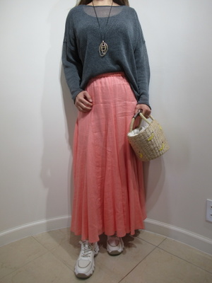(今どき透かし編みニットを着こなす)透かし編みのおしゃれなニットはふんわりスカートでフェミニンに着こなしたい。春風にゆれるスタイリングで一気に春全開。