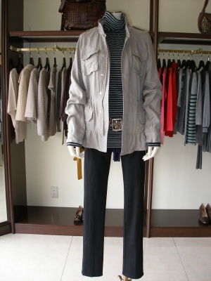 キュプラベースのジャケットはさらっとした着心地。ヒップが隠れる丈なのでスティックパンツともよく合います!エレガンス度70%、アクティブ度30%。