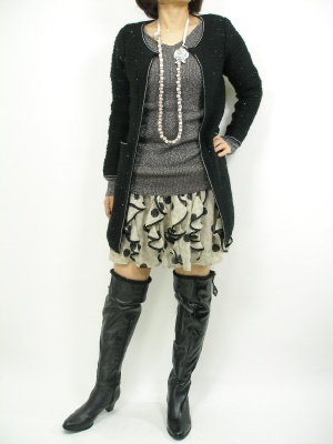 ヒラヒラミニをロングジャケットで大人っぽく。流行りの着こなしはニーハイブーツで完成します!エレガンス度60%、スタイリッシュ度40%。