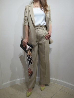 (かっこいいジャケットコーデ)テーラードですが裏なしのソフトなジャケットは着崩して着用してもかっこいい。ややゆるめの揃いのパンツでまとめてONスタイルに。
