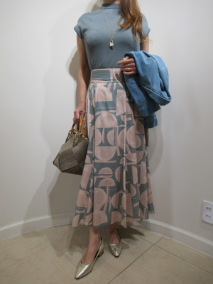 (スカートとニットのお出かけスタイル)ふんわりとしたフレアスカートはピンクベージュの柄物でエレガントに。トップスはコンパクトなニットで合わせるとおしゃれなお出かけスタイル。まだ羽織がほしい季節ですのでGジャンをプラスしました。