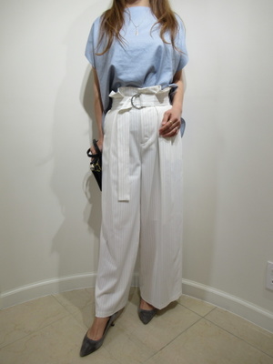 (ワイドパンツをかっこよく)ウェストマークのワイドパンツはざっくりとしたトップスで合わせ、今季らしいゆるシルエットを強調するとバランスの取れたシンプルな中にもかっこいいスタイリングになります。色は爽やかにブルーと白で。