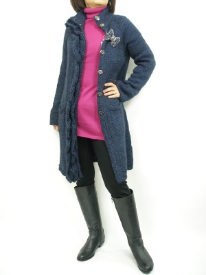 ネイビーのざっくりニットにピンクのインナーが映える。顔周りに明るい色があるとイキイキした表情になりますね!スタイリッシュ度70%、アクティブ度30%。
