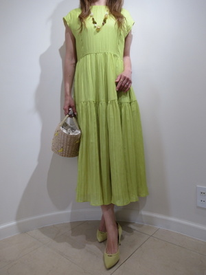 (そろそろ夏ワンピの出番)夏に向けてロングワンピースが多くでてきました。黄色が鮮やかなワンピースはお出かけにピッタリ。アクセントはカゴバッグで。