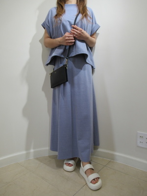 (カットソーのアンサンブル)カットソーの生地が着やすい上下のセットアップ。スカートはロングですがフレアなので足さばきもいいですね。サンダルにもぴったり合うコーデでGWのお出かけに。