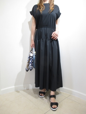 (カジュアルな黒のワンピース)カットソー地のカジュアルなワンピース。スカート部分は二段切替のギャザースカート。デイリーのワンピースには着心地の良さが一番。