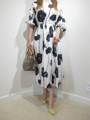 (大きなプリント柄のワンピース)プリント柄も二色使いのモノトーンな色使いなのでシックに大人っぽく仕上がった夏のワンピース。夏のお出かけに重宝。