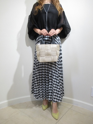 (モノトーンのおしゃれコーデ)白×黒を基本にモノトーンで合わせたコーデ。スカートは柔らかいアコーディオンデザインなので全体にフェミニンなふんわりした印象に。大人のモノトーンコーデ。