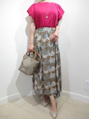 (柄のスカートでフェミニンコーデ)カーキ色の「柄のスカートに合わせたピンク系のカットソー。鮮やかな色の赤に近いピンクで夏ファッションによく合うバランスの良いコーデ。