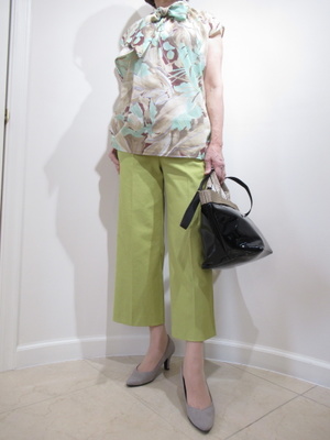 (おしゃれなパンツスタイル)クロップド丈のパンツに柄のブラウス。片側リボンタイにしてエレガントさをプラスしたシンプルなパンツコーデ。