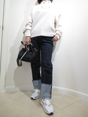 (普段着なトレーナータイプが重宝)フード襟のトレーナータイプのカットソーはデイリーには欠かせない一着。折り返しのデニムでおしゃれな休日ファッション。
