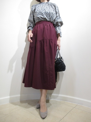 (シックな秋色でコーデ)ボルドー色が秋を感じさせてくれますね。合わせてブラウスも小花柄のシックな一着です。ギャザーのウェーブが優しいコーディーネート。