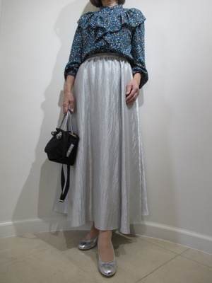 (シルバーのスカートで華やかに)マルチカラーのブラウスとロングのスカートで華やかな装いに。シルバースカートは歩くたびにギラギラと揺れてより一層に華やかに。