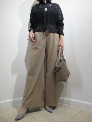 (シースルーブラウスを着る)レース地の透け感があるブラウスをワイドパンツで合わせる。秋一番のスタイリッシュなコーディネート。