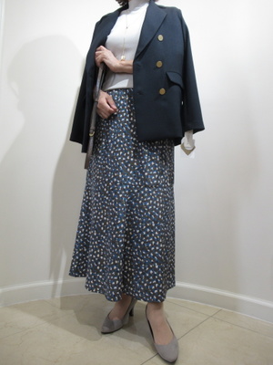 (柄スカート+紺ブレコーデ)水色ベースの柄物スカートはとろみのある生地感のフェミニンなデザイン。ロング丈で落ち感もあるスッキリとした着こなし。半袖ニットをインナーに着用し紺ブレを肩にかけて甘辛ミックスコーデに仕上げました。