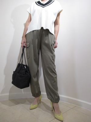(ニットベストにカーゴパンツをかっこよく)このニットベストは今の時期は一枚で着用し半袖としても活用できます。Vネックが程よい開きで黒のラインがかっこいい。カーゴパンツ+ヒールパンプスでスタイリッシュに。