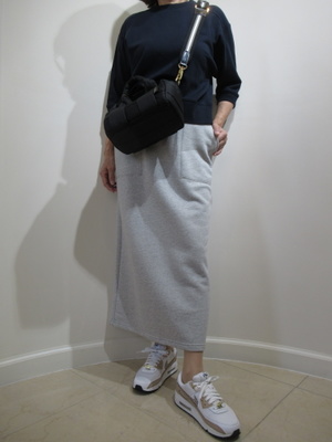 (タイトスカートのカジュアルコーデ)タイトスカートでカジュアルコーデに。少し長めの丈感なので厚底スニーカーでバランスを取ってアクティブに。トップスのカットソーは短丈デザインで脚長効果にぴったり。