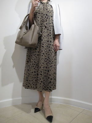 (アニマルプリントのワンピース)アニマルプリントは少しハードなイメージですがベーシックなボウタイのワンピースにするときちんと感の出るおしゃれな印象に。グラデーションになるようなグレージュのカーデを肩にかけ合わせました。