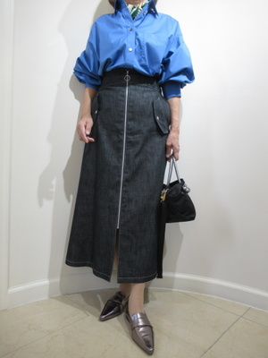 (ブルー系のシャツでスタイリッシュに)シャツ+ロングスカートでスタイリッシュなコーデ。ブルーとブラックの色合わせでかっこよく合わせましたが、プラススカーフを首周りに添えてアクセントをつけ顔映りが明るく華やかな印象に。