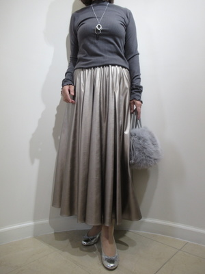 (シャイニースカートでフェミニンに)流行りのシャイニー系・・・今回はスカートに取り入れてギャザーの分量が多いシルエット、ゴールド系でまとめたおしゃれなコーデ。
