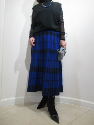 (ニットのアンサンブル)ノースリーブのトップスは脇ラインのスリットが深いので下に透け感のあるインナーを重ねてみました。黒を基本にコーデしたエレガントな装い。