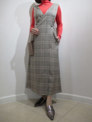 (ロングタイトのジャンスカを着る)チェック柄のジャンスカはロング丈の大人っぽいシルエットが特長。明るいオレンジ系のニットをチョイスして。アクセントにはお財布ポーチ。