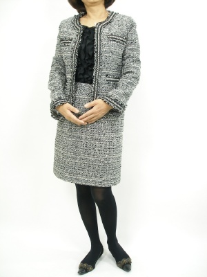 着崩すツイードも良いけど、たまにはスーツで決めてみたい。黒のパンプスでは硬いので、淡カラーのパンプスにして軽やかに!エレガンス度80%、フェミニン度20%。
