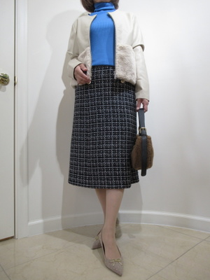 (エレガントコーデに合皮のジャケットをプラスして)シンプルなニット+ツィードのスカートでエレガントにプラス。合皮にファーをあしらったジャケットを合わせてお出かけスタイルに。