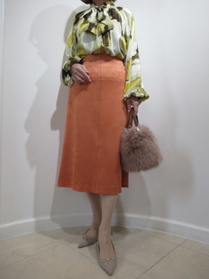(お出かけスタイルのブラウス)ボウタイになったプリント柄のブラウスとシンプルなタイトスカートでさらっとコーデして。この生地のお出かけスタイル。