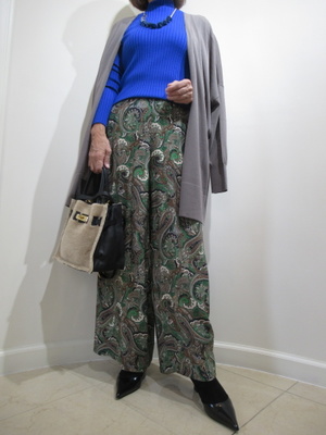 (ワイドなプリント柄のパンツで)とろみのある生地のワイドなプリント柄のパンツを鮮やかな青のニットとコーデしてグリーンとブルーのコントラストがおしゃれなコーデ。