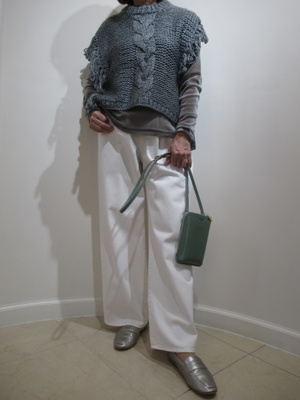 (カジュアルなニットベスト)フリンジ使いで大振りなカジュアルニットベスト。ちょっと短丈なので下のカットソーとレイヤードで重ねすぎるとデイリーもやっとオシャレになりますね。