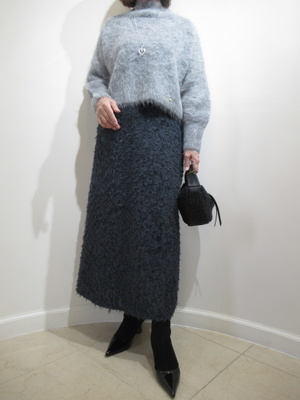 (質感の違うシャギーを合わせて)トップスのニットのシャギーにはふんわり優しい風合い。ボトムスはタイトのシャープなシルエットでメリハリを持たせて。色もグレーのグラデーションで大人ぽく仕上げました。