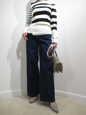 (きれいめデニムでスタイリッシュに)大人のきれい目デニムを変形ボーダーニットですっきりスタイリッシュにまとめてみました。