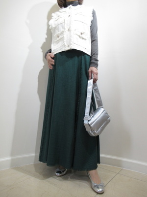 (コンパクトなジレが活躍)ロング丈のスカートにはコンパクトな丈のジレをあわせるとバランスの取れたコーデになる。最近の暑い毎日にもぴったりなコーデ。