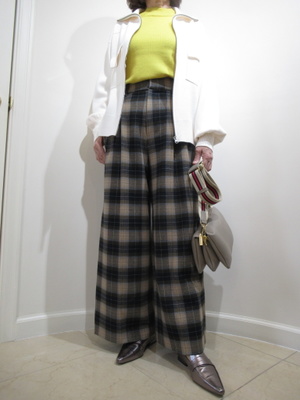(大柄なチェックのパンツスタイル)大柄なチェックなのでトップスに明るい色を持ってきてメリハリをつけるとスタイリッシュなコーデが出来上がる。