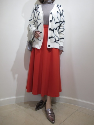 (トップスをざっくりカーデで合わせたコーデ)フレアスカートのフェミニンスタイルにモノクロトーンの柄カーデを合わせるだけで若々しくおしゃれ度がアップしますね。