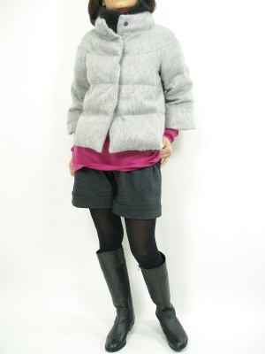 ボリュームダウンをショートパンツでスッキリ着こなして。グレー系の差し色には鮮やかな色がお薦め。今回はピンクでキュートに!フェミニン度90%、スタイリッシュ度10%。